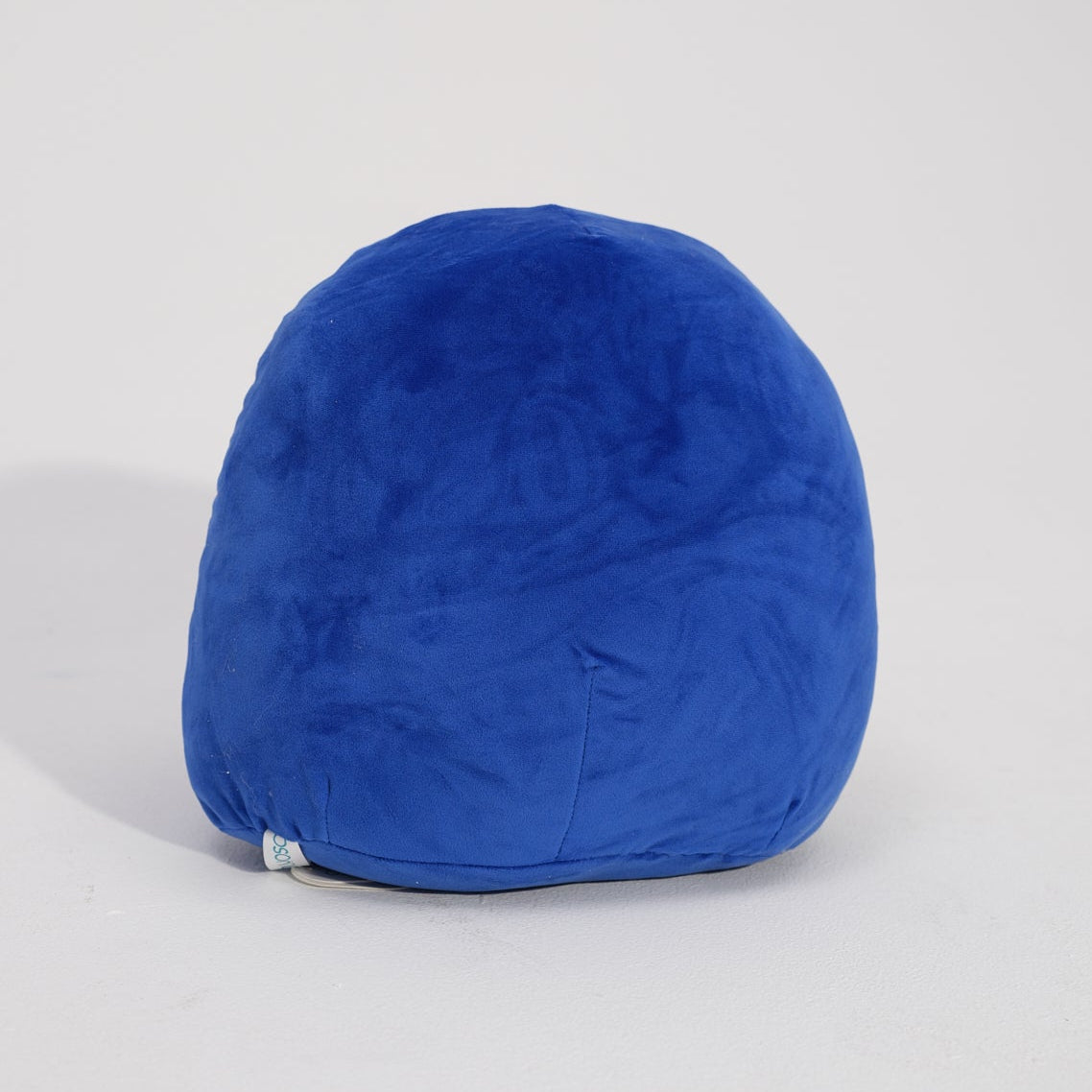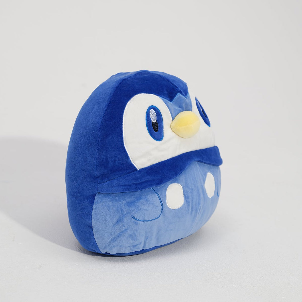 • Blue plush toy with a penguin design on a light gray background